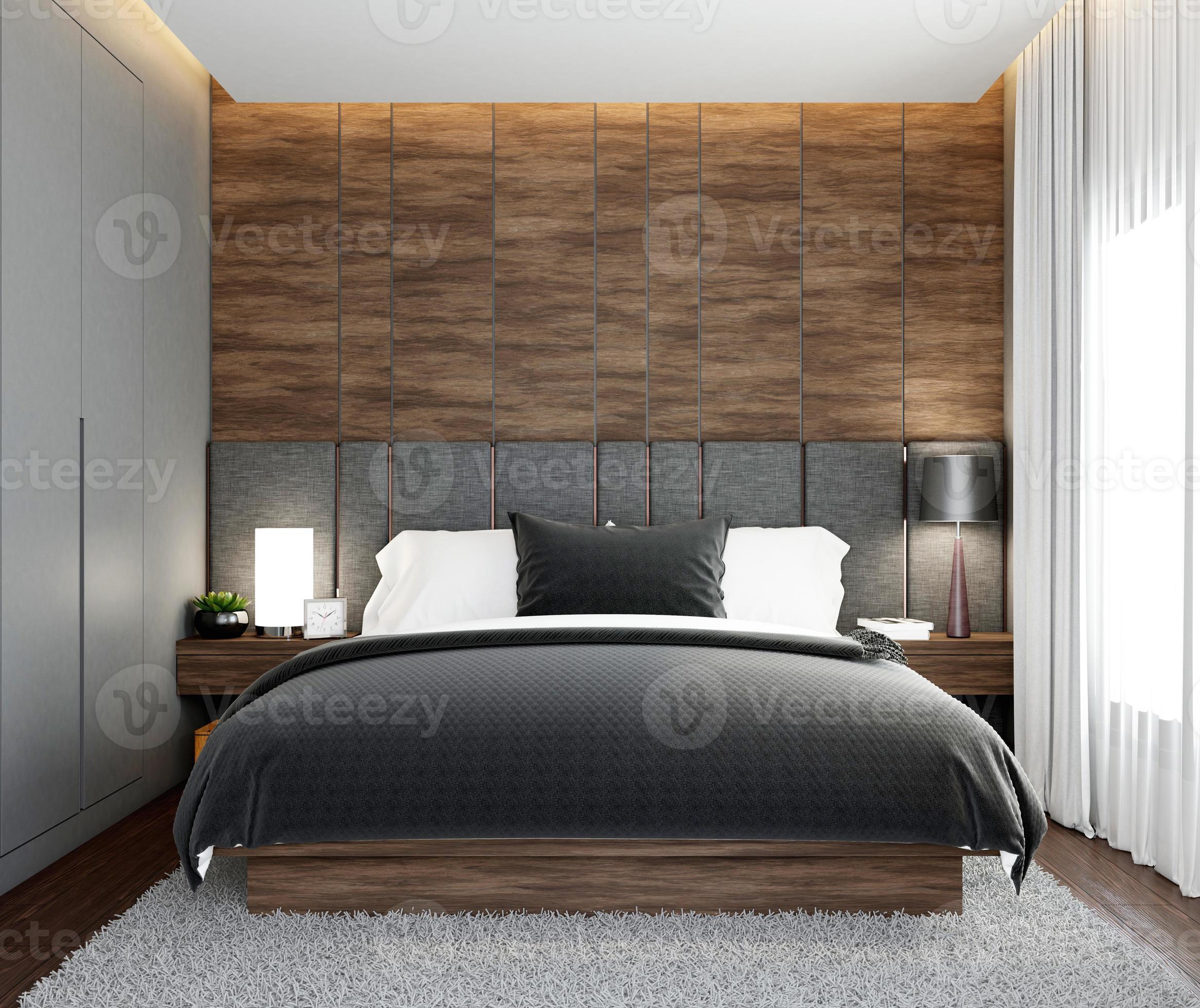 Luxury Bedroom With Wood Pattern Wall And Gray Wardrobe Gray King Size Bed And Brown Wood Floor 3d Rendering 5386687 Stock Photo At Vecteezy